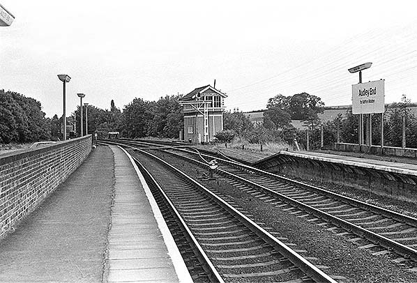 Photo by Ian Baker ![]() The London end of Audley End main line station in 1974. The parapets of Audley End viaduct are just visible in the gap between the trees, left background. Platform lighting was of the fluorescent type bearing the station name as widely introduced by BR, particularly in the Eastern Region, during the 1950s. The Saffron Walden platform, however, remained gas lit to the end. In later years BR removed the name from these fluorescent lamps, probably as a 'one size fits all' economy measure, at many, if not all, so-fitted stations. The siding adjacent to the signal box once extended north and butted up to the end of the down platform. When the platform was extended southwards at an unknown date the section north of the points was removed. The points themselves were also further north originally, immediately beyond the end of the platform. The original purpose of the siding is not clear but it may have been used for splitting down goods trains requiring to drop off wagons for the goods yard or Saffron Walden branch.