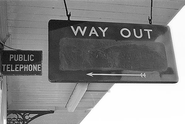 Photo by David Burrows from his Flickr photostream ![]() In 1974, despite Audley End main line station by then having been given Corporate Identity black and white signage, this Eastern Region blue enamel sign still hung beneath the up platform canopy. The painted-out wording was 'and to Saffron Walden trains' in block capitals but with 'Saffron Walden' in larger size. It is not known if the sign survived but in all probability it did as by the 1970s Eastern Region items such as this, once redundant, were sent to York to be sold; ‘redundant assets’ from the other four regions were sold at Collectors’ Corner near Euston station. The Public Telephone sign was once also a common sight and a few can still be seen at their original locations. Most had white lettering on a blue background, the shade of which varied according to who the sign originated with. The type of sign seen above usually indicated a public telephone kiosk (commonly, 'phone box') but the most familiar type read 'You May Telephone From Here' and indicated a telephone inside a building which was available for, but not exclusively for, use by the public. One of the latter type survives at the time or writing on the former station at Stretham on the long-abandoned Ely - St Ives line. These signs originated over a century ago with the National Telephone Company, the forerunner of the GPO*, but most, if not all, survivors are of GPO origin. Others were erected by motoring organisations with those of the RAC being diamond-shaped and in a lighter shade of blue. It should be remembered that at one time only businesses and the wealthy had telephone lines installed. The majority of the public relied upon public telephones and telegrams, this remaining the case until the 1960's. [*General Post Office. The state-owned GPO ran the postal service (Royal Mail), telegram service and a major proportion of the telephone network. They were once also responsible for issuing wireless (radio) licences under the Wireless Telegraphy Act. Indeed, the GPO ruled over virtually all forms of communication. The requirement for a radio licence has long since been abolished. The GPO ceased to exist as a result of Mrs Thatcher's privatisation polices; the GPO being split into Royal Mail and British Telecommunications, both initially remaining state-owned. British Telecommunications ultimately became what is currently known as BT.]
