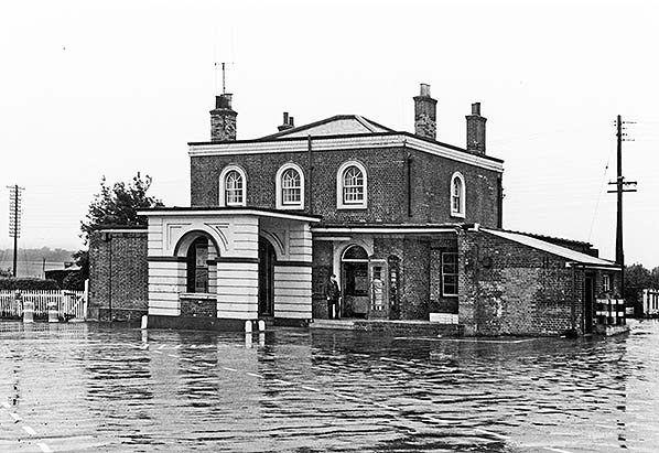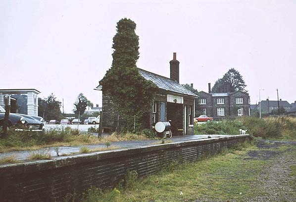 ![]() Audley End main station building in July 1970. A compact building, the stationmaster's house was the section to the left of the gutter downpipe and may have extended across the entire top floor. At this time, the building was looking a little shabby and the contrast between the porch and the bricked-up doorway on the right could not be more noticeable. At least the K6 telephone kiosk is protected from the inclement weather. The former Saffron Walden branch platform is behind the photographer. The building is today somewhat smarter; the area in which the K6 lurks is now partially enclosed and a newsagent's shop now stands on the right. The K6 is now located outside the building and