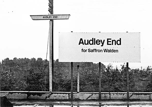 adjacent to the shop Photo by John Mann ![]() A BR Corporate Identity running-in board, as prescribed by Dr Beeching but which took some years to implement on a large scale, on the main line station. This signage was retained until the coming of Network SouthEast and the useful 'for Saffron Walden' part was dropped but returned, as described elsewhere, following much rigmarole in 2012. As Audley End House is some distance from this station (it is actually located on the north-western edge of Saffron Walden), removing the 'for Saffron Walden' part left the station name rather pointless and the station may as well have been given back its original Wenden name.