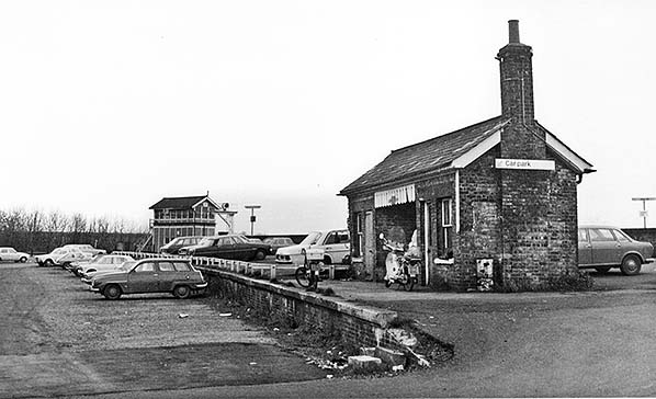 Photo by David Burrows from his Flickr photostream ![]() A similar scene to that of July 1970, captured in March 1977. Some changes are apparent; the platform building has lost one chimney, a car park sign has appeared, the fence at the rear of the platform has gone (the existence of which was rather pointless) and crash barrier-type structure has appeared at the platform edge. Also, some effort has been put into providing a better surface for car parking. A number of mopeds are also present. Among the commuters’ cars are some more-upmarket models; a Rover P6 and, directly ahead of the camera, a rather splendid Saab 95 estate. Further along from the Saab is an MGB GT while the light-coloured car partly obscured by the platform building is possibly a Mercedes.