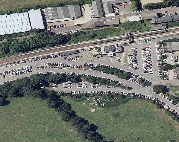 ![]() Audley End station seen from the air in the early years of the 21st century. The length of platform extensions of the main line station, whose platforms were once staggered either side of the footbridge, is evident when compared to much earlier plans and maps. Cambridge is to the right (north) and Liverpool Street is to the left (south). The main station building and its portico can be seen, as can the footbridge which is the modern version built adjacent to the site of the original. A train bound for Cambridge can be seen at the down platform. At the top of the image is the business park which occupies the site of the former mill, gasworks and down siding. At the extreme centre right, part of the former Neville Arms can be seen and the line of cars parked neatly against its perimeter occupies the site of the siding which ran through the goods shed. No trace whatsoever remains of any of the station's former goods facilities, at least not in the view above. In the centre of the image is the Saffron Walden branch platform. What was the Saffron Walden branch can be seen curving away towards bottom right; the car park extends over the area once occupied by the running line and siding, stopping just before the former Mutlow Hall level crossing. The 'appendage' to the car park at the bottom of the site never contained railway tracks. It is merely making the best use of railway property, the lower boundary of the car park being the limit of railway land. Compare the boundary to that marked on early maps. The existence of this plot of land is curious. It is known that around the time of construction of the Saffron Walden Railway, and for a few years subsequently, there was talk of providing a locomotive turntable at Bartlow. It is therefore reasonable to suggest that one might also have been proposed for Audley End and, if so, this may have been the reason why the boundary ended up as it did and resulted in today's 'appendage' to the car park. Great Eastern Railway records do, indeed, make several mentions of a turntable and, in some cases, turntables at Audley End. Some specifically mention wagon turntables but those which omit to mention 'wagon' are nevertheless deduced as referring to same, so the question of whether or not a locomotive turntable was proposed at Audley End and land obtained for the purpose will probably never be decisively answered.