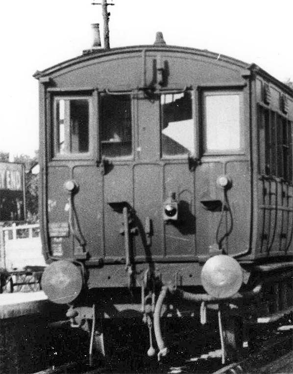 A close-up of cab of driving trailer E63423E prior to working the 3.36pm to Bartlow in September 1956. The driving trailer would, of course, be at the rear of the train on the journey to Bartlow, hence the tail lamp. Looking at the above image, the driver sat on the righthand side of the cab. The two outermost windows appear to be openable and there is no obvious sign of any form of windscreen wiper, despite it being perfectly possible to have fitted an air operated wiper; air and vacuum operated wipers being once very common. Towards the top of the cab front the hooter can be seen. Technically, these were low-pitched whistles but sounded more like hooters. Many years ago Peter Handford and Transacord Records released a 45rpm 7in EP (Extended Play) record of these G5-powered push & pull trains in use on the Saffron Walden branch just before they were withdrawn in 1956. On it, the hooter can be heard in action and in conjunction with the locomotive whistle. On the left the plate bearing the wording 'Audley End Saffron Walden Bartlow' can be seen with 'P&P' painted onto the body panel below it. When previously on the Palace Gates service, there was probably a plate bearing something like 'Nth. Woolwich Palace Gates' but to date no photographs have been seen which confirm this. Pipe connections on the cab end of the driving trailers were just the standard brake and train heating fitments as locomotives would not, obviously, be coupled to this end when operating