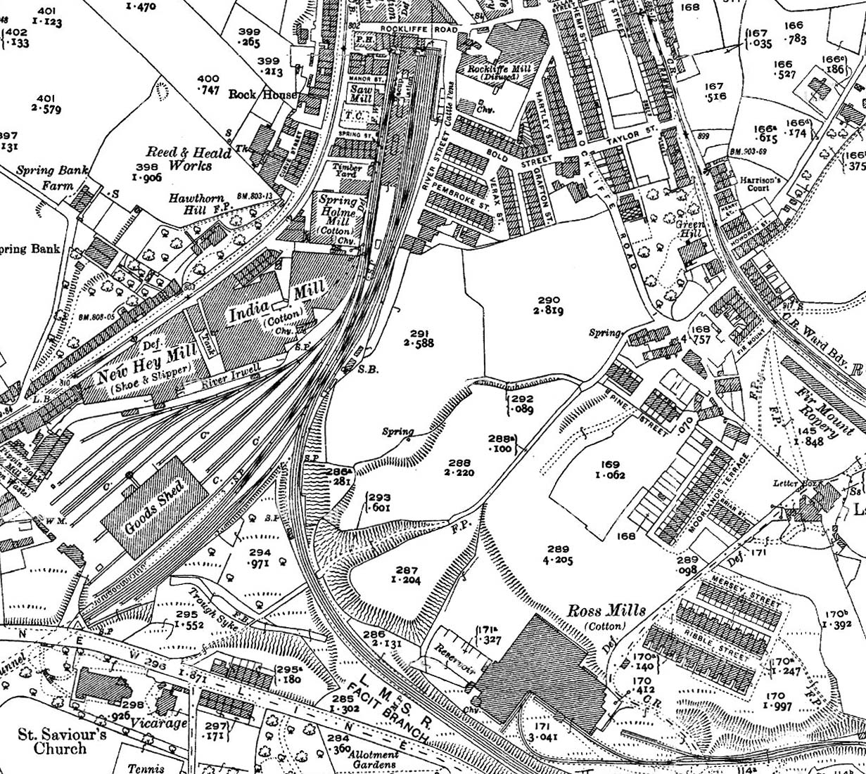 1930 1: 2,500 OS map. The facilities at Bacup station are basically unchanged since the map of 1892. The Ross mill now has railway sidings. Street tramways now offer competition either side of the railway: the route on Church Road (west of the station) goes to Rawtenstall while to the east along Rochdale Road the tramway serves Britannia, Shawforth, Facit, and all points to Rochdale. Of the Facit Branch stations only Shawclough & Healey is distant from this tram route.