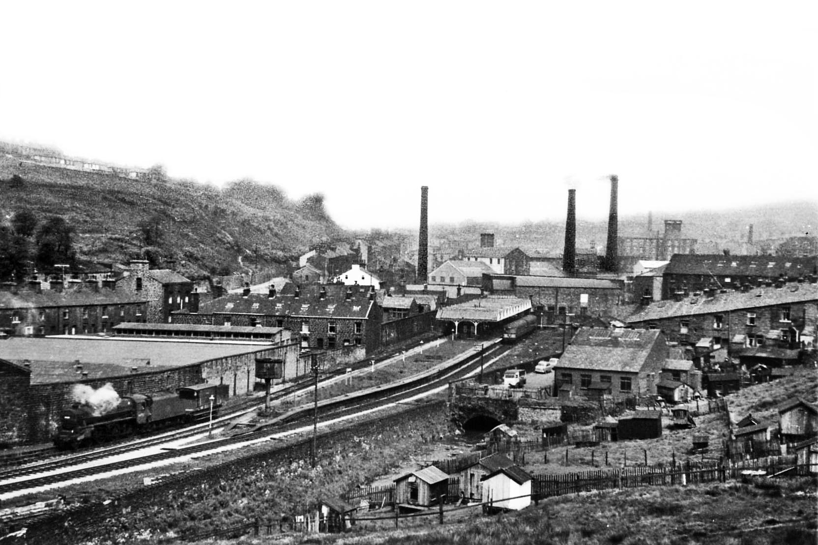 On 10 June 1966 a Cravens 2-car diesel multiple unit is at the far end of the up platform at Bacup, adjacent to the glazed roofing. To the left, ‘Black Five’ No.44728 is engaged in some shunting activity with a guard’s van. The wall of India Mill is immediately beyond the loco. The River Irwell can be seen emerging from a culvert towards the bottom of the photograph. The chimneys of Plantation, Throstle and Forest cotton mills are seen in the background. No.44728 is a Stanier-designed 4-6-0 built at British Railways’ Crewe works in January 1949 and allocated to 26C, Bolton shed. She survived into the final months of steam on BR, being withdrawn on 31 January 1968 to be disposed of at Drapers, Neptune Street Goods Yard, Hull the following May.