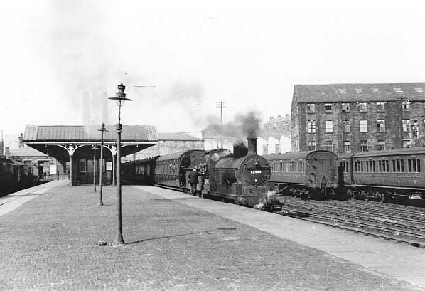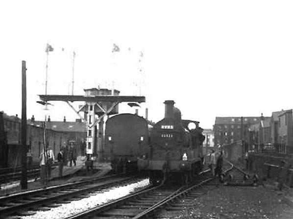 In September 1954 a passenger train stands at the east face of Bacup’s island platform. At this stage the station is well maintained. The loco is an Aspinall-designed Class LYR27 0-6-0, built at the Lancashire & Yorkshire Railway’s Horwich works in October 1896. Numbered 118 by the LYR then 12334 by the LMS she finally carried BR No.52334. In January 1955 she was withdrawn from 26A, Newton Heath shed, to be cut up at Horwich works, probably later that year