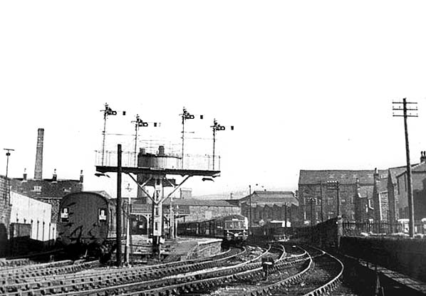 Photo by T K Widd ![]() Looking north at Bacup Station in 1956 after DMUs had been introduced to the line. The introduction of DMUs gave Bacup the most intensive service that it was ever to see, A Metro Cammel DMU can be seen at the platform to the right whilst locomotive-hauled coaching stock can be seen
