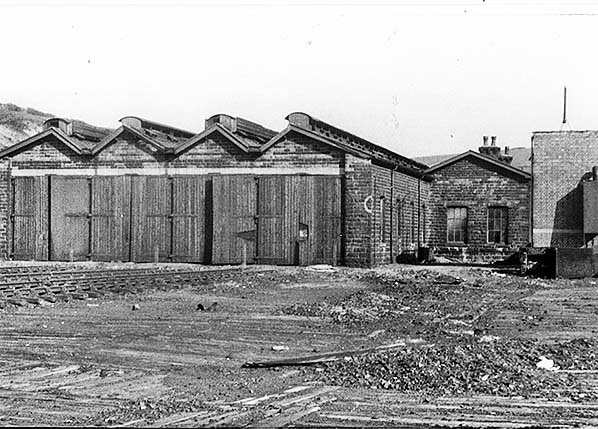 The engine shed at Bacup is seen here in 1955, the year after it closed. The sidings into the shed remain in situ as they would until the early 1960s. The view is looking south-east.
