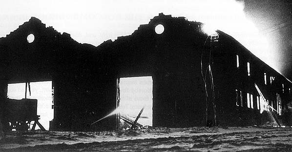 This dramatic photo records the destruction by fire of the goods warehouse at Bacup on 11 January 1959. The photograph was taken at 3.15am as firemen tackled the blaze.