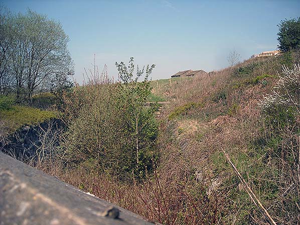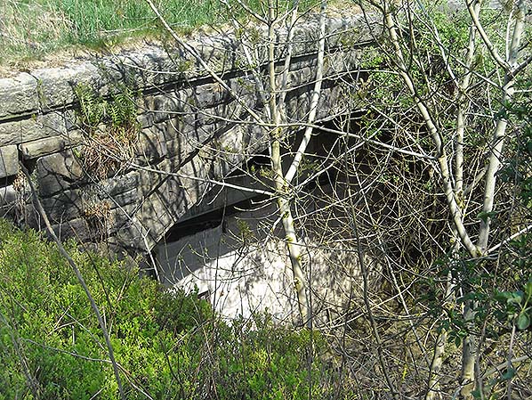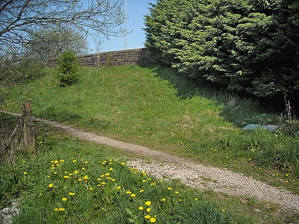 The route of the former Rochdale – Bacup railway (the Facit Branch) can be walked from Shawforth and Britannia as far as the point seen on this photograph, where the earth has been built up as high as the stone parapet, burying the bridge where New Line crosses the railway trackbed. This photo was taken in May 2016.