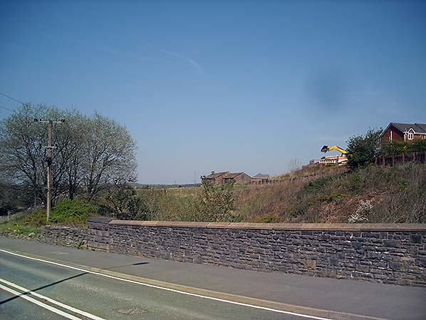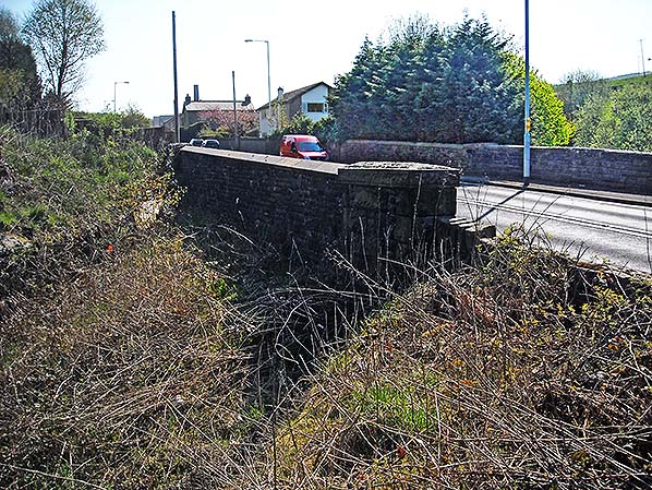 Looking north-west across New Line, a road between Britannia and Bacup, where it crosses the route of the former Rochdale – Bacup railway. Although the bridge on which the photographer is standing in May 2016 has been filled in, the parapets have been left in place. Beyond the parapet on the opposite side of the road is the short, overgrown cutting that separates this bridge from the Bacup (or Newline) Tunnel.