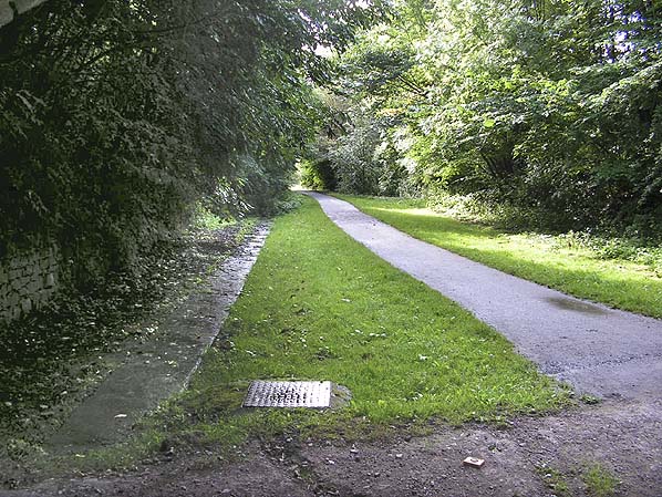 ![]() Looking towards the south in August 2008 at the surviving southbound platform edge the stones of which can be seen to the left of the picture. The track bed has been filled in up to platform level. Photo by Paul Wright