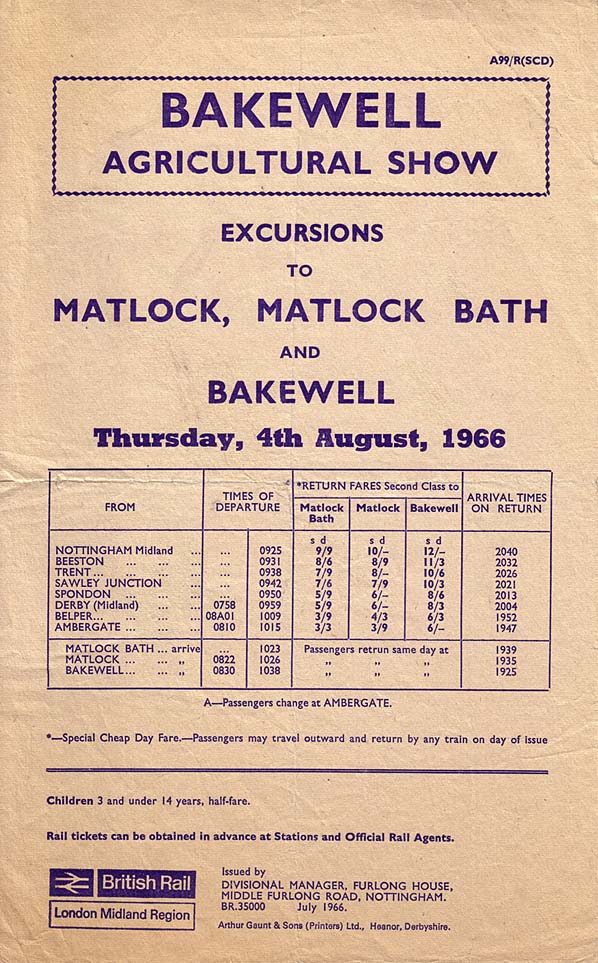 ![]() A handbill advertising train services to Bakewell for the annual Show in August 1966. By this time, few excursions were run in connection with the Show. By the following year’s event, the station had closed. From Rowsley Association