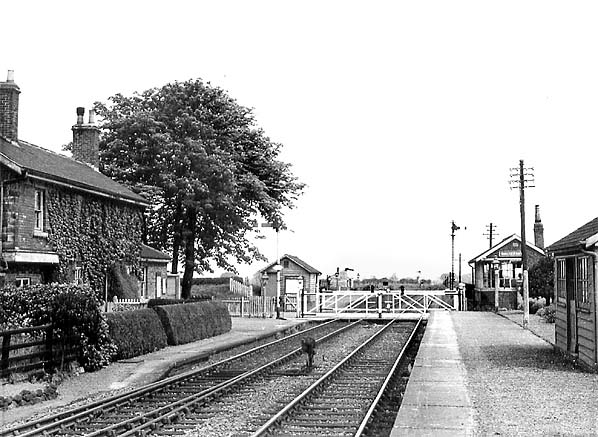 ![]() Baldersby station looking east from the up platform c.1958. The original low down platform is seen on the left with its replacement on the far side of the level crossing.