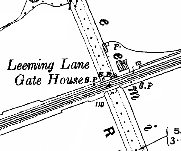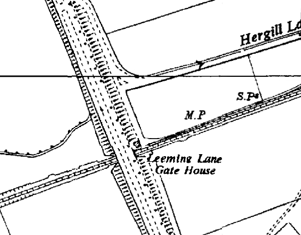 ![]() A1 road bridge west of Baldersby station in September 2009. There was originally a level crossing here with a signal box and gate house called Leeming Lane Gates. This was replaced by a bridge in the mid 1950s when the road was widened. Although demolished the gate house is still named on the 1956 map below. This is sometimes referred to locally as York Gates but it never officially had that name, the confusion comes because there is a York Gate Farm to the south of the level crossing. This name pre-dates the railway.