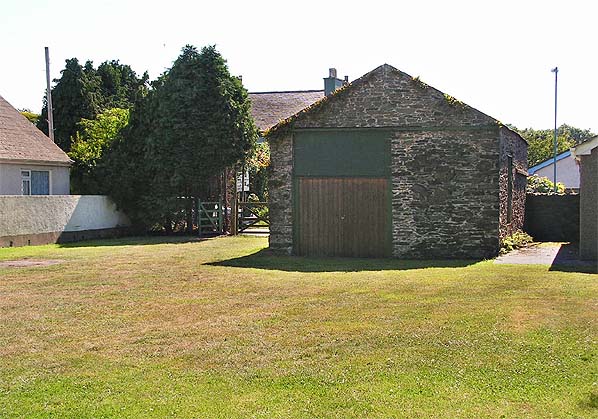 ![]() The goods shed at Ballaugh in July 2006. The gate to the left of the goods shed is the site of the level crossing. The building on the right stands on the site of the former station building. Photo by Paul Wright