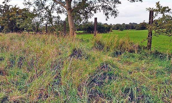 The north end of the Ballyheather Halt platform seen on 9 September 2020. Upturned rails that had been used as fence posts can be seen at the rear of the platform.