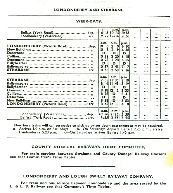 In 1934 (following the closure of the engine shed at Londonderry Victoria Road) the passenger service was reduced to three trains in each direction and some of these were mixed trains.