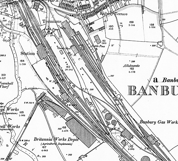 for fruit and vegetable traffic. Photo from John Law's Flickr Photostream ![]() ![]() 1885 1:2,500 OS map. Merton Street terminus with its trainshed is shown. At this time the platform didn't extend much beyond the trainshed and a siding is shown running up to the end of the platform. To the east of the station there is a large cattle dock and pens but as yet the cattle market top the east hasn't been built. The dock is served by three sidings, each with a wagon turntable at the end for moving individual wagons between the sidings. To the west of the shed is the station goods shed with a further three sidings one of which passes under the shed's canopy. Two of these sidings have wagon turntables either side of the shed. Road access to the goods yard is from the west side of the station forecourt. There is a weigh bridge (WB) and office opposite the goods shed and the yard 5-ton capacity crane is located to the south of the shed. Merton Street signal box is located some distance to the south of the station. The Merton Street engine shed is sited to the east side of the line to the east of the station. The shed had two roads running through it and two sidings on the west side. A 30 foot diameter turntable is seen to the north of the shed close to the signal box. Banbury Gas Works is located on the west side of the line opposite the engine shed. This is served by one siding which runs through the works and the connects with the GWR station yard to the west. To the north of the gas works there is a connecting line between the LNWR and GWR. The closeness of the two stations is clearly seen. Note a terrace of houses in Merton Street called Railway Terrace. It is assumed that these are for railway staff. Click here for a larger version.