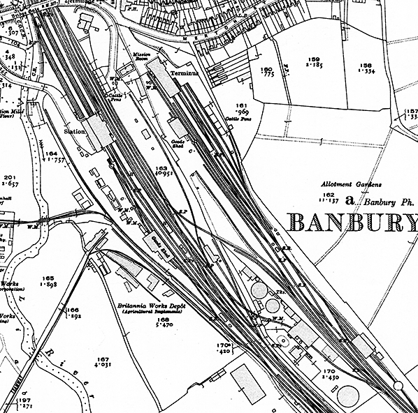 ![]() 1900 1:2500 OS map. Little has changed from the earlier map. A new siding from the GWR crosses the connecting line between the LNWR and GWR (see 1963 picture), this served coal staithes located between the two Banbury stations. Click here for a larger version.