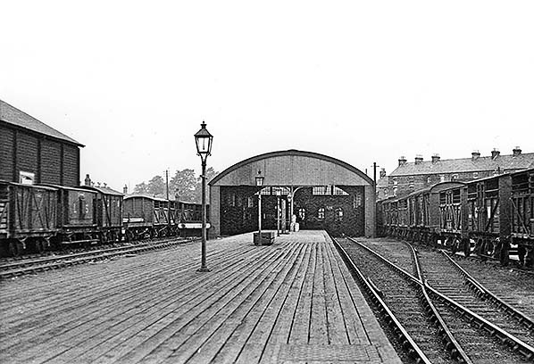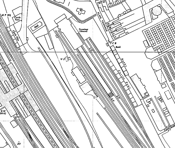 ![]() 1920 1:2500 OS map. A number of changes are noted between this and the earlier maps. The platform has been extended. Most of the wagon turntables have been removed leaving just two to the south of the goods shed. The weighbridge and office has been located to the entrance to the goods yard alongside the trainshed. The turntable to the north of the engine shed has been removed and replaced by a new 40' turntable to the south of the shed. A railwaymens' mission has been built on the west side of the station forecourt and a new terrace of railway cottages (Alma Terrace) has been built on the east side of the station. Click here for a larger version