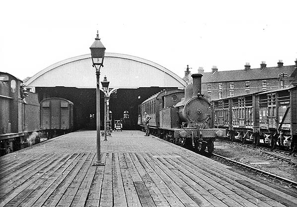 ![]() In LMS days an ex-LNWR Webb 2-4-2T waits at Banbury Merton Street. She has a two-vehicle train, the first being a Brake Third which may suggest the second was a van of some description. The date of the photograph is unknown but the masking of the platform lamp casements tells us it is during WWII. Note what appears to be a serviceman, rather than a member of railway staff, on the platform. Note, too, the tricycle on the platform. These once common contraptions came in a number of forms according to requirements. This example has a rearwards opening compartment for shopping etc., a popular configuration, which could probably also adapt as a seat for a dog or small child. The Webb 2-4-2Ts came in 4ft 6in and 5ft 6in types (reference to driving wheel diameter) and that seen here is a 5ft 6in example but not push-pull fitted unlike many of her sisters. Also unclear, indeed completely so, is the locomotive's identity and its shedplate is unreadable so we have no way of knowing which route the train will take at Cockley Brake Junction but due to the infrequency of the service on the SMJ route the train is probably for the Buckingham route. Sadly, confirmed photographs of trains for the SMJ route at Banbury are rare. On the left a Fowler 4F 0-6-0, again unidentified, appears to be pausing between shunting duties. On the right stood a seldom photographed loading gauge, the view of it often being obstructed, and in this view its bracket is visible above the nearest cattle wagon. Given that the sidings on the right were, after the 1920s, used mainly for cattle traffic the loading gauge must have subsequently seen little use. Of the Webb 2-4-2Ts, the 4ft 6in versions were early withdrawals with some sold for further service elsewhere, including in Ireland which involved regauging, but all had gone by 1936 or thereabouts. The 5ft 6in variant did rather better with many trundling on to see British Railways although not all late survivors did so for long enough to receive their allocated BR numbers. The final example, No.46616 which began life as LNWR No.662 in 1891, bowed out in September 1955. She finished up at Swansea but had been a long-time resident of Northampton shed, which kept her in smart condition, and therefore would almost certainly have visited Banbury via the tranquil SMJ route. Copyright photo from John Alsop collection ![]() Looking towards the buffers at Banbury Merton Street sometime during LMS days. The goods shed, far left, was of wooden construction and it seems the intention had been to reconstruct it using bricks but this was destined never to happen. On the platform, the Sugg's 'Windsor' style gas lamps are still in place; later these would be replaced by the 'Rochester' style which gave better light in the downwards direction. The hatch in the platform, foreground, most likely gave access to the cranks in the point rodding for the points on the right. By the time the station closed, the connection between the platform road and the siding had been removed. The connection cannot have had much practical purpose and indeed appears all-but disused in this view. The large volume of cattle traffic at Merton Street is described elsewhere and, as ever, numerous cattle wagons can be seen here along with a couple of vans and an LMS brake van. Among the cattle wagons on the right lurks a 6-wheel van which appears to be a slatted milk van. It is possibly of Midland Railway origin but this particular detail is unclear. Milk vans were used to carry churns of which some, as it happens, can be seen on the platform in the distance. Under magnification the churns appear to be of the pre-1930 17-gallon type, these being superceded that year by the more familiar 'mushroom-head' 10-gallon type. Milk churns, used for their intended purpose, have long since become a thing of the past and the carriage of churns by rail ceased sometime during the 1960s although nobody seems to know the precise date. Churns were once a familiar sight at railway stations and on wood or stone platforms alongside rural lanes where farmers would leave them to await collection by road vehicles. The latter practice continued for a while after churns by rail ceased.