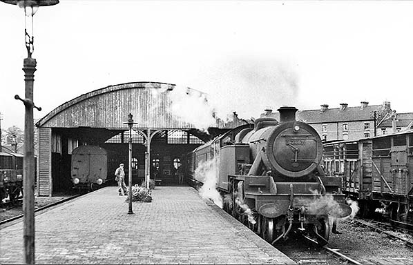 Copyright photo from John Alsop collection ![]() The only date clue for this poor photograph is the BR number on the locomotive, an ex LMS-Stanier 2-6-4T. Apart from the number being of five digits beginning '42', it is unfortunately otherwise totally unreadable. Without a precise date or full locomotive number, the destination of this train, formed of two ex-LMS carriages, must remain a mystery