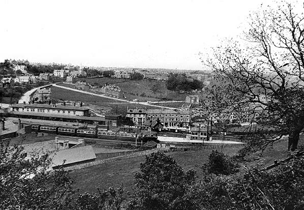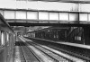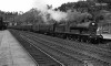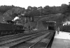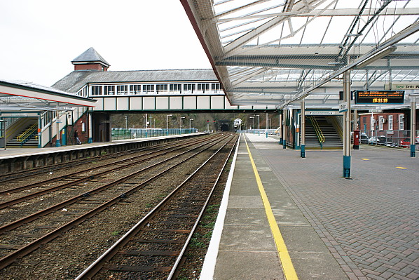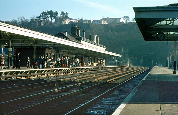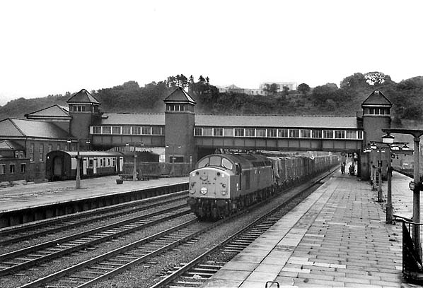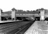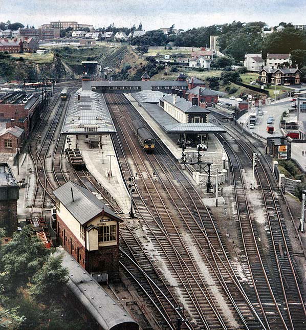 Copyright photo from the John Mann collection ![]() Looking north-west at Bangor station from the eastern end of platform 3 in 1932. Copyright photo from the John Alsop collection ![]() Bangor station looking east from an elevated position in 1955. The layout of the station at its western end is clearly shown. The roof of the locomotive shed can be glimpsed to the right of the station. Copyright photo from the John Alsop collection ![]() Looking east towards Bangor station from the engine shed approach lines on 20 October 1963. The Caernarvonshire Rail Tour is seen taking on water at platform 4. The footbridge seen just beyond the first locomotive provided a link from the down island platform to the goods yard. Copyright photo from the John Mann collection ![]() A view looking north-west at Bangor station from the high ground above the 890 yd Bangor Tunnel in August 1963. The station is seen as it was in its largest form. To the left is Bangor locomotive depot which was still open when the view was taken. The island platform immediately to the right of the shed was the down platform. It actually had three platform faces, two of them serving through lines numbered 3 (to the right) and 4 (to the left). A short bay platform can be seen in the foreground with a wagon standing adjacent to it; this was originally used by Bethesda branch push-and-pull trains. The two signal boxes that controlled the lines through Bangor can also be seen. Bangor No. 1 is to the left of the Bethesda bay and No. 2 is at the far end of the station. Photo by Chris Davies ![]() Bangor station looking south-east in 1969. A class 40 locomotive is seen passing through on the down fast through line on a mixed freight. The covered footbridge that was built in the 1920s dominates the view. Copyright photo from the John Mann collection ![]() Looking south-east along platform 3 at Bangor on 2 February 1975. Although the station had lost many services over the previous fifteen years it still had its four through platforms at this time. Photo by Alan Young ![]() Looking north-west at the 1848 station building at Bangor on 27 May 1975. At that time it was still part of the island platform that had been created by the LMS in the 1920s. The front of a Metro-Cammell DMU can just be seen standing at platform 1. Another DMU of the same class is seen standing at the middle part of platform 2. Photo by Alan Young ![]() Bangor station looking north-west from the up platform on 31 January 2013. This platform had originally been number 1. After the LMS altered it to an island platform in the 1920s it became number 2, number 1 being to the right. At the time of this photograph only two platforms were in use.