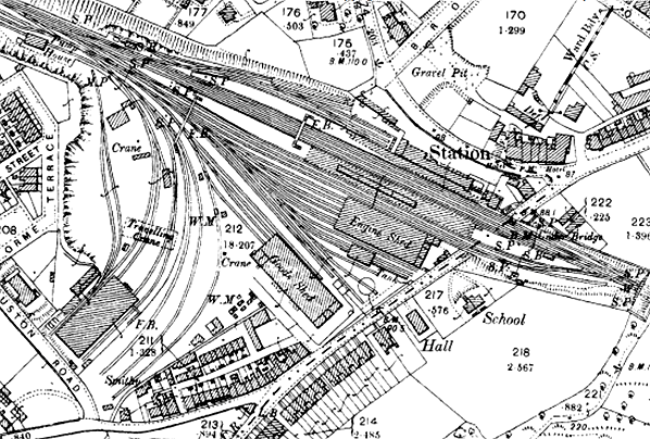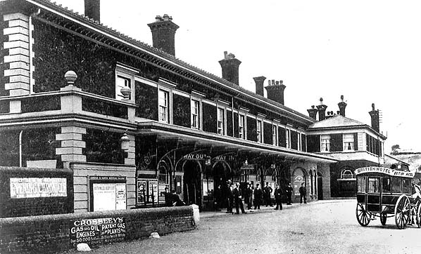 ![]() Bangor station as seen on a 1963 map. The map shows the station in the form that it took following the alterations that the LMS made in the 1920s. The up platform had been converted into an island, and the new entrance building with its booking office can be seen to its north. ![]() Bangor station’s original building of 1848, looking west in 1906, when it was the main entrance to the station. In the 1920s the LMS created a platform in front of the main entrance, and the building was altered to form on-platform facilities. A new entrance and booking hall was built further to the west.