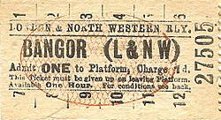 ![]() Bangor station, looking north from an elevated position in the early years of the twentieth century. At this time it had three through platforms. A signal box can be seen on the down island platform towards the right. It was later replaced with a larger box closer to the Bangor Tunnel. A bay was created near to where it stood for Bethesda branch trains.