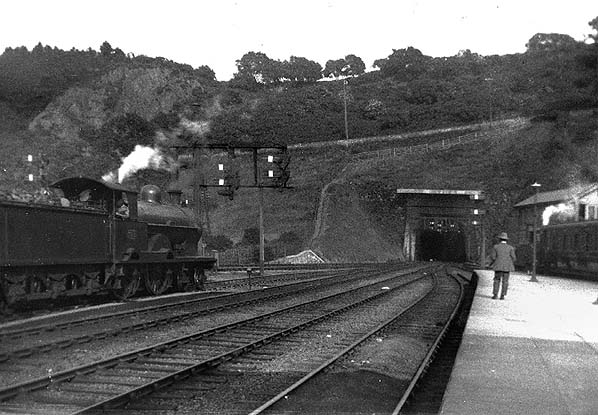 Looking south-east from Bangor station’s platform 3 towards the west portal of Bangor tunnel in the 1930s. To the right of the view a Bethesda push-pull train can be seen standing