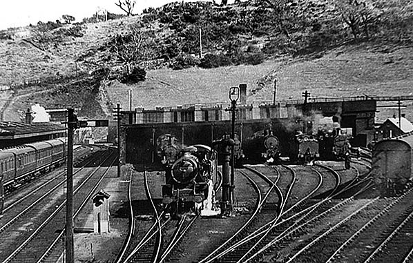 Bangor locomotive shed looking south-east from the footbridge that connected the down platform of Bangor station to the goods yard in the late 1930s. Over the years there were three sheds at Bangor. The first was ooened by the Chester & Holyhead Railway on 1 May 1848. When the LNWR absorbed the Chester & Holyhead on 1 January 1859 they replaced the shed, probably in the same year, with a five road structure. In 1884 Bangor station was enlarged and the shed had to be moved. It was replaced by a standard LNWR six road Northlight shed which is seen in this view.