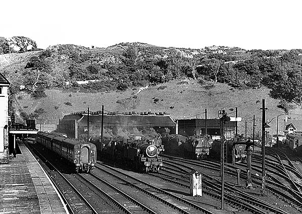 Bangor locomotive shed in May 1961 seen from the footbridge that connected Bangor station's down platform to the goods yard. The shed was re-roofed by BR in 1957/8 only to close on 14 June 1965.