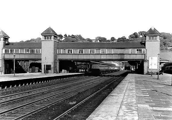 Looking south-east from the western end of Bangor station’s platform 3 in 1955. The covered footbridge dominates the view. Waiting to depart at the east end of platform 2 is an eastbound train.