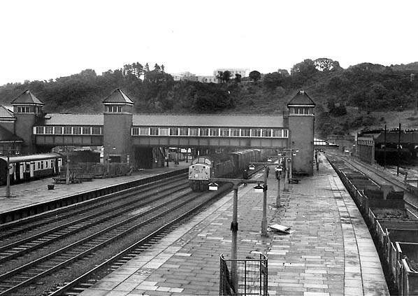 The down island platform at Bangor seen looking south-east in 1969. A class 40 locomotive on a mixed freight is passing through on the down through line on route to Holyhead.