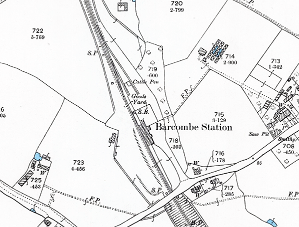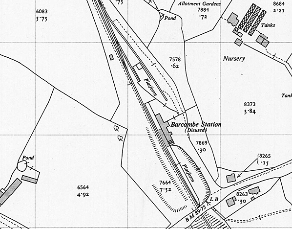 ![]() 1956 1:2,500 OS map. The station was closed to all traffic in 1955 and is therefore shown as 'disused' The line into Lewes was reopened temporarily in August 1956 but Barcombe station remained open to all traffic. The signal box was abolished in 1931 and has been demolished. Both the passenger platform and cattle dock are identified as 'platform'.