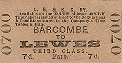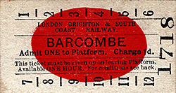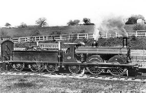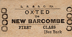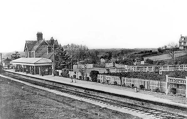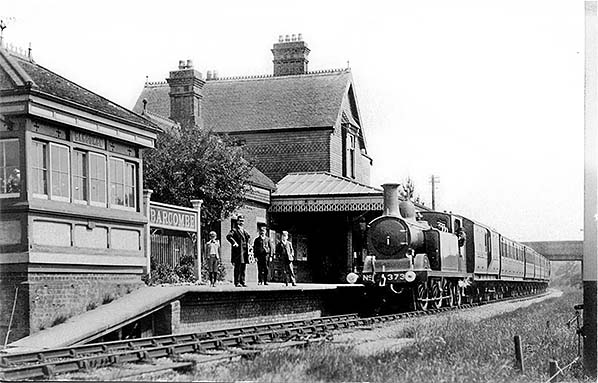 Photo from John Mann collection ![]() A view of Barcombe facing toward Culver Junction and Lewes. The locomotive is D3 class 0-4-4T No. 373. The livery of the rolling stock, apparently all-over umber, suggests the period is no earlier than 1910 . The train comprises a mix of six, eight and, it would appear, four wheeled vehicles. There is of course a brake vehicle at each end. A reasonable view of the signal box is offered, with its small nameboard mounted above the central window. The signal box roof has ornate ridging but to a different style to that on the roof of the station building.. On the platform are a young boy and three members of staff, one, third from right, very likely being the stationmaster. Locomotive No. 373 was new in December 1892 and to a design by Robert Billinton. The class was at one point in its life named with No. 373 carrying the name 'Billingshurst'. Names were painted onto the tanks in true 'Brighton' fashion but it is unclear in this photograph if the name was present. Following the 1923 Grouping the Southern Railway initially renumbered the locomotive to B373 and then to 2373. She survived into British Railways days and was allocated the BR number 32373 but it was never carried as she was withdrawn, from Horsham shed, in November 1948. This photo was also used for a colourised postcard.