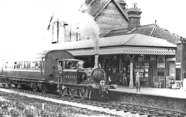 Copyright photo from John Alsop collection ![]() Photo from John Mann collection ![]() In this undated view Stroudley A1 Class No. 673 poses for the camera, along with a crew member and the boy on the platform who seem determined not to miss out. Two men can be seen in the gloom beneath the canopy and at least one is a staff member. Period advertisements can be seen, among which are the ubiquitous Pears Soap and Mazawattee Tea examples. The carriage is one of the famous LB&SCR 'Balloon' types and appears to be one of those built in 1907 as Push - Pull Brake Thirds. Initially they commonly worked solo with a suitably fitted A1/A1x 'Terrier' locomotive but this view does not appear to show a Push - Pull working. It has not been possible to identify the working by the headcode display on the locomotive, the crossed disc and the lamps, so it may have been some form of special. The locomotive is of particular interest. She carries the dark umber livery and lettering style in vogue during the 1905 - 1911 period and had been named 'Deptford' prior to the 1906 de-naming policy. In 1912 she was modified to Class A1x and in 1919 was sold to the Edge Hill Light Railway, Warwickshire, where she became No. 1 to be followed in July 1920 by unmodified sister No. 674, once named 'Shadwell' which became No. 2. Both exiled locomotives were officially withdrawn and scrapped in 1946 but in reality both had stood effectively derelict for some twenty years. The curious story of the Edge Hill Light Railway and its locomotives is well worth reading and plenty of information is available online and in books.