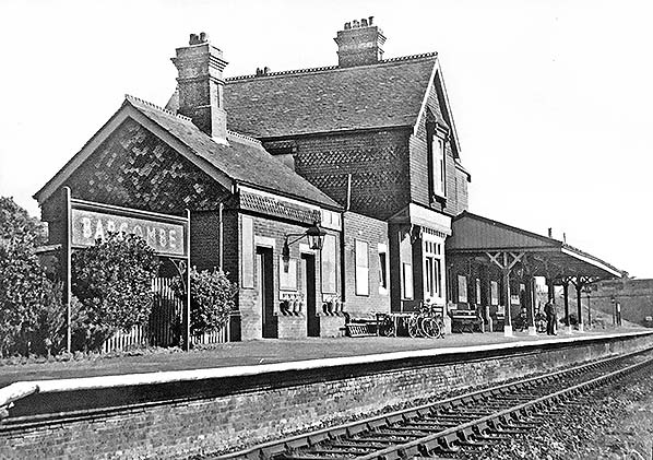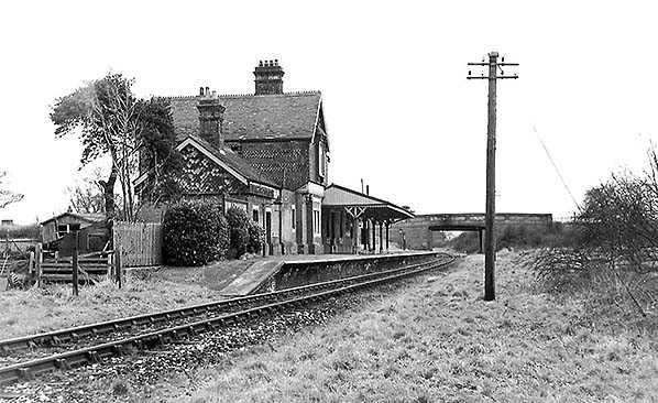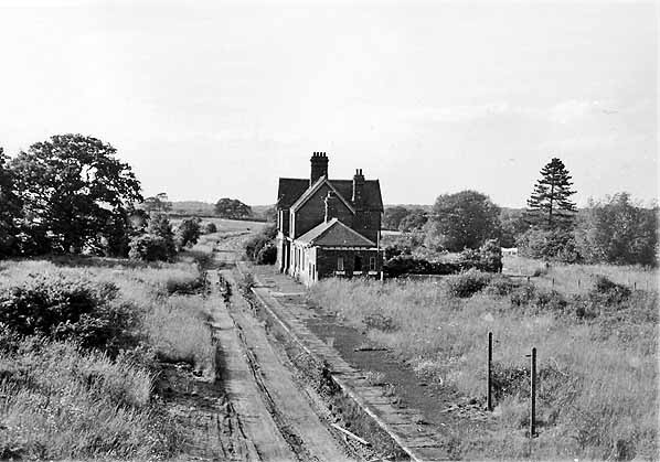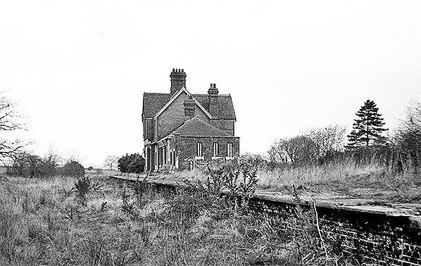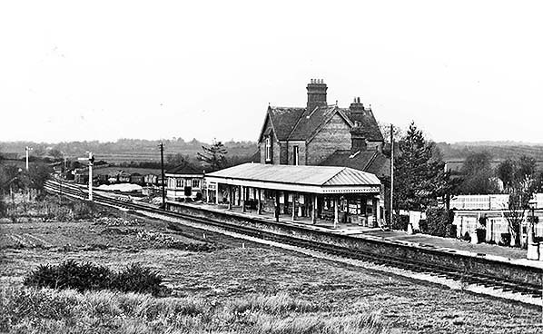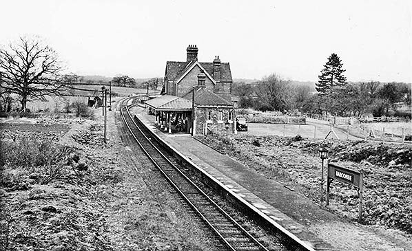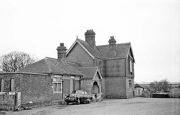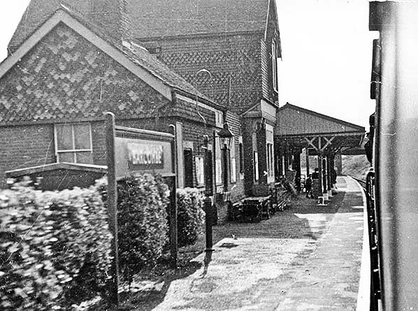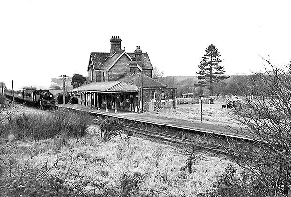 Photo from John Mann collection ![]() A view looking north-east from the road bridge in March 1958. A southbound train approaches but it will not be stopping as the station had closed in 1955 as described elsewhere. The train is probably an Oxted - Brighton working and it carries the usual headcode disc arrangement for the period (there is a second disc at the centre bufferbeam position). The train will shortly reach Culver Junction and join the Uckfield line. The locomotive is a BR Standard 4 2-6-4T. A batch of these locomotives was built at Brighton Works and a number of them worked on the Southern Region. The train is not the more familiar numbered set, rather it appears to have a Maunsell 3-set at the rear with the front three vehicles being so-called 'loose' vehicles, also of Maunsell origin. The station retains evidence of the WWII blackout, or ARP, precautions. Across the network it was by no means unusual for these to remain for many years after the war. While we do not know for certain, the motor car parked at the bottom of the approach road may well have belonged to the photographer. The vehicle appears to a Ford Consul EOTA, sometimes known retrospectively as the Mk 1.