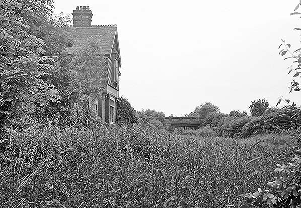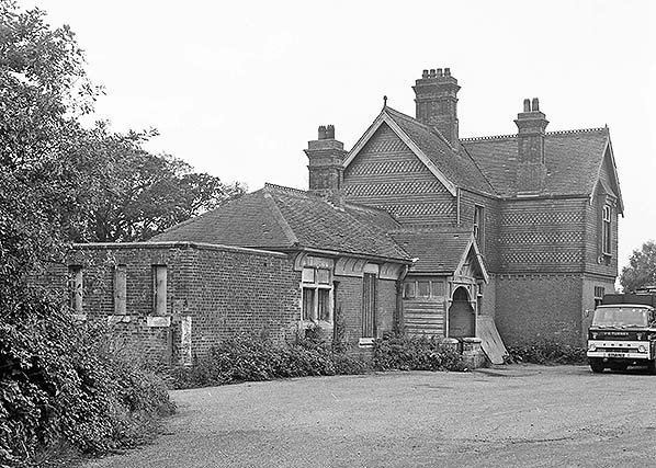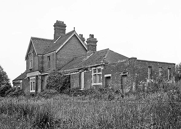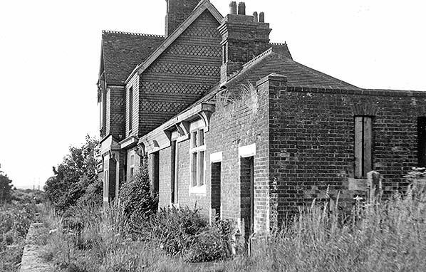 Photo from John Mann collection ![]() The poor condition of the station building is clear in this c1971. Manyof the roof tiles on the ladies waiting room are broken. Lower floor windows are generally boarded up while those on the upper floor are now glassless.