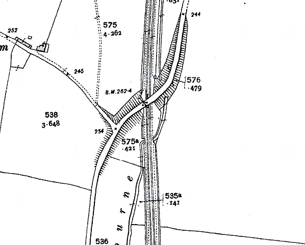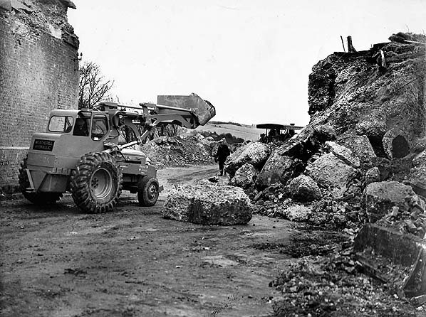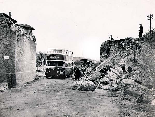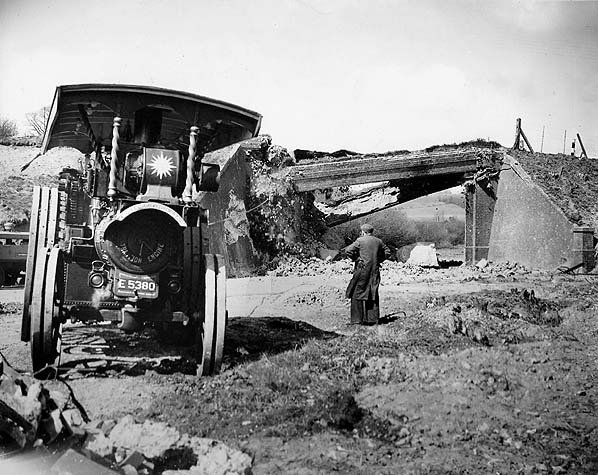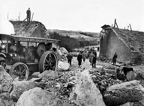During the demolition of the bridge road traffic had to come down onto the railway line. The bus seen here is an East Kent Guy Arab IV built in 1953 with a Park Royal 58-seat body. It was one of 30 delivered that year. Unlike many other East Kent busses which had open entrance platforms, these busses had doors. The bus is on route 17 from Folkestone - Canterbury. The 17 still follows the same route through the Elham Valley today.