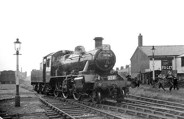 ![]() The RCTS Mid Lancs railtour at Barnoldswick station on 22 June 1962. 78036, which operated only the Earby - Barnoldswick leg of the tour, is seen running round its coaches. This loco entered service on 13 November 1954 at Preston shed. Built at BR's Darlington works to the Riddles Standard Class 2 design, it had a working life of only 12 years, when it was withdrawn from Shrewsbury shed in December 1966 to be scrapped by Cashmores of Newport in August 1967. It was a development of the Ivatt class 2 design for the LMS that incorporated many of the original design features such as rocking grates, hopper ashpans and enclosed cabs to make a locoman's life a little easier. There are 4 of these