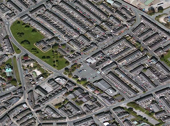 ![]() Recent aerial view of Barnoldswick station site. Although nearly all evidence of the station has gone at ground level the original boundaries have been maintained and are identical to the 1962 Ordnance Survey map. The station and goods yard site is now occupied by a Co-Op store and car park while the coal yard is mainly open space.