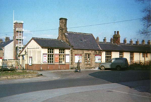 Barnoldswick station forecourt in the early 1960s. The stone booking office built by the Barnoldswick Railway is original. The wooden buildings were provided by the Midland Railway. The site is now occupied by a toilet block.