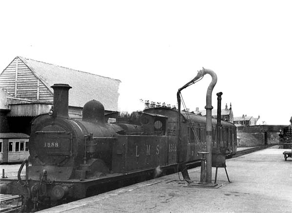 ![]() A single-coach passenger train is seen at Barnoldswick station c. 1930s. Built in 1892 to a design by Johnson, this 1P, 0-4-4t emerged from Dubs and Co. works in the March. It was renumbered to 58061 by BR in 1948 and lasted in service until November 1950, when it was withdrawn from Skipton shed to be scrapped at Derby works shortly after. Note the large timber goods shed with an awning over and adjacent siding in the background.