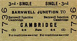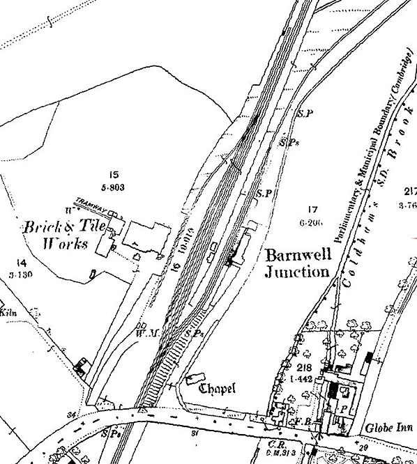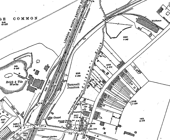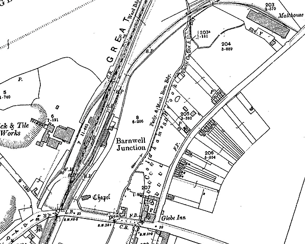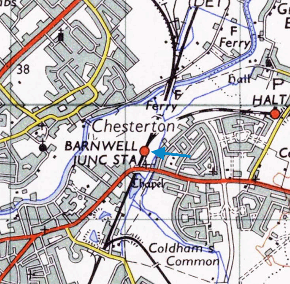 Notes: Barnwell Junction was the first station on the Mildenhall branch and opened with the Cambridge - Fordham section on 2 June 1884. Whereas the Railway Clearing House and Ordnance Survey referred to the station as ‘Barnwell Junction’, and the British Railways signs carried this name, in timetables it seems always to have been simply ‘Barnwell’.