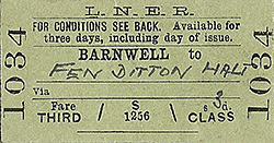 The Railways Act of 1921 saw the GER become part of the London & North Eastern Railway (LNER) on 1 January 1923. On this date Mildenhall Golf Links Halt was renamed Worlington Golf Links Halt. The ‘Halt’ suffix appeared in timetables and on tickets but not on the halt nameboards. As the halts had no proper platforms, the GER introduced carriages fitted with retractable steps. Initial conversions were of increasingly antiquated 6-wheeled stock. Because the halts lacked booking facilities the GER introduced ‘conductor-guard’ working, and for this purpose the carriage stock had to be modified to allow the guard to move through the train. Tickets from Quy were also issued on the train.