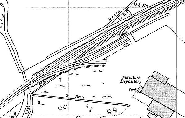 1965 1:2,500 OS map showing the oil siding and the truncated siding into the brewery siding. By this date the brewery building had found a new use as a furniture depository.