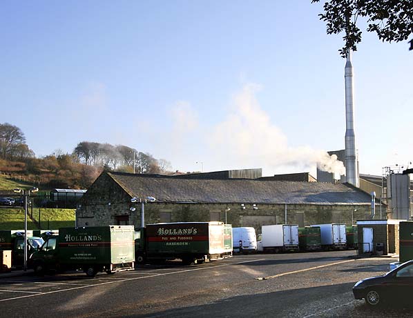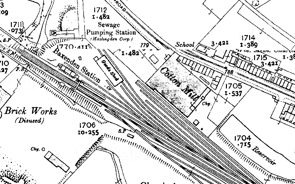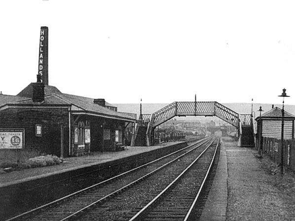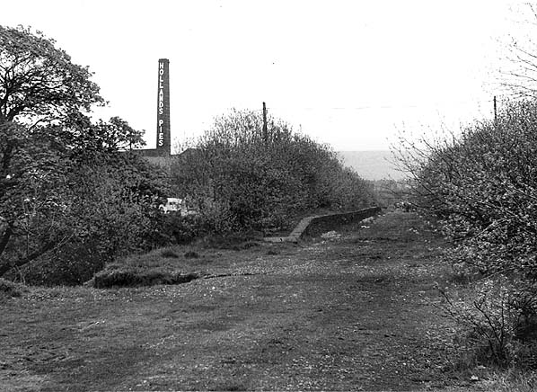 Baxenden station was located some distance south of the village, closer to Rising Bridge. As the line was double track it was provided with two platforms. The main station buildings were located east of the line on the Manchester-bound platform. The main building was a smart single-storey stone structure. The platform elevation featured a recessed waiting area, flanked by wings which were pierced by paired round-headed windows. A slate hipped roof projected forward, supported by wooden brackets, to form a small awning. On the Accrington direction platform a small timber shelter with a slated hipped roof was provided. In later years a lattice-pattern footbridge was added to link the two platforms. There were extensive sidings on both sides of the running lines, south east of the station. The large stone goods shed with its adjacent 10-ton crane was immediately east of the passenger station, and, further to the east, sidings served a cotton mill, later to be taken over for the manufacture of Holland’s Pies. (This firm, now part of Northern Foods, operates from modern premises, the imposing former mill building having been demolished.) To the south west of the running lines sidings served two chemical factories. (Nichol's Chemicals) and other sidings served The Lancashire Brick and Terra Cotta Co, and Baxenden Colliery.