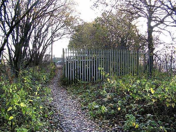 Looking south along the trackbed of the Clifton Junction and Accrington line towards the site of Baxenden station in November 2010. The north end ramp of the southbound platform can be seen to the left of the picture. The northbound platform lies hidden behind the palisade fence.